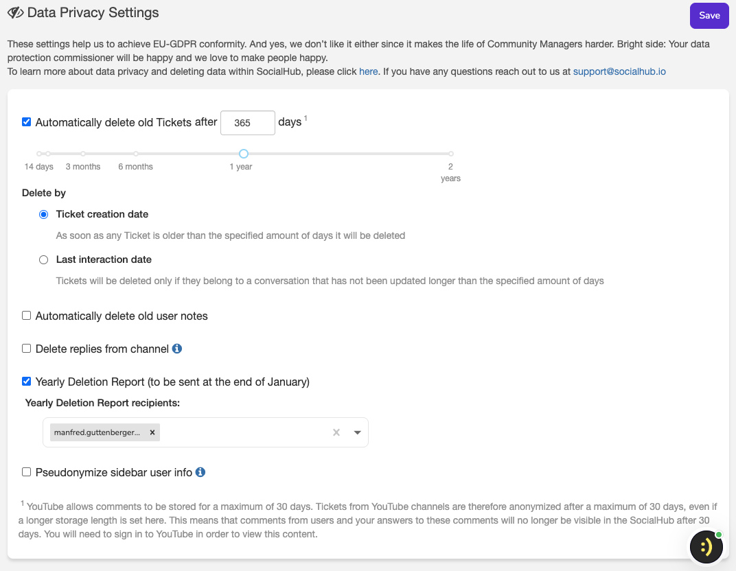 Here you can implement the prescribed deletion concept for your SocialHub. You can choose the time periods in which old tickets should be anonymized and whether this should depend on when the ticket was created or when the last interaction took place. You can also have a “deletion report” sent to you, which will provide you with confirmation by email that the deletion has been carried out, along with some additional information.