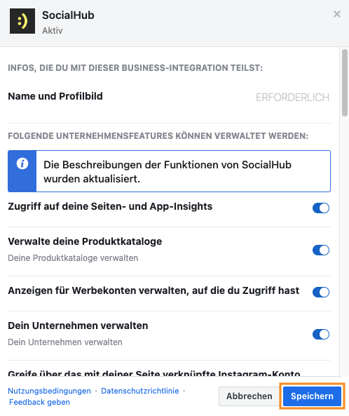 By clicking "View and edit" on the SocialHub integration, all available permissions are listed. Make sure all of them are enabled and that the Facebook page you want to add to your SocialHub account is also listed.