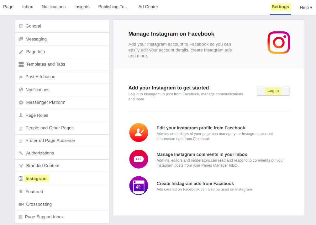 Open the settings for the Facebook page you want to link to your Instagram account. You will find the option to link the two accounts in the "Instagram" section.