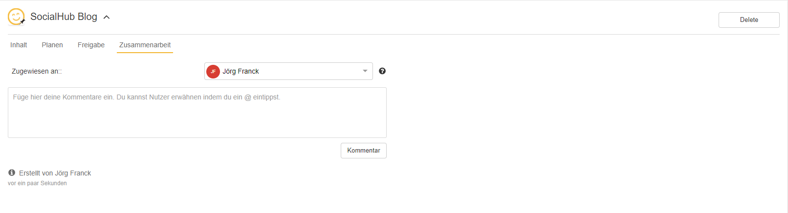 Ici, vous pouvez ajouter des commentaires et sélectionner des collaborateurs via le champ déroulant. Dès que le commentaire a été enregistré, l'employé sélectionné recevra un e-mail à ce sujet.